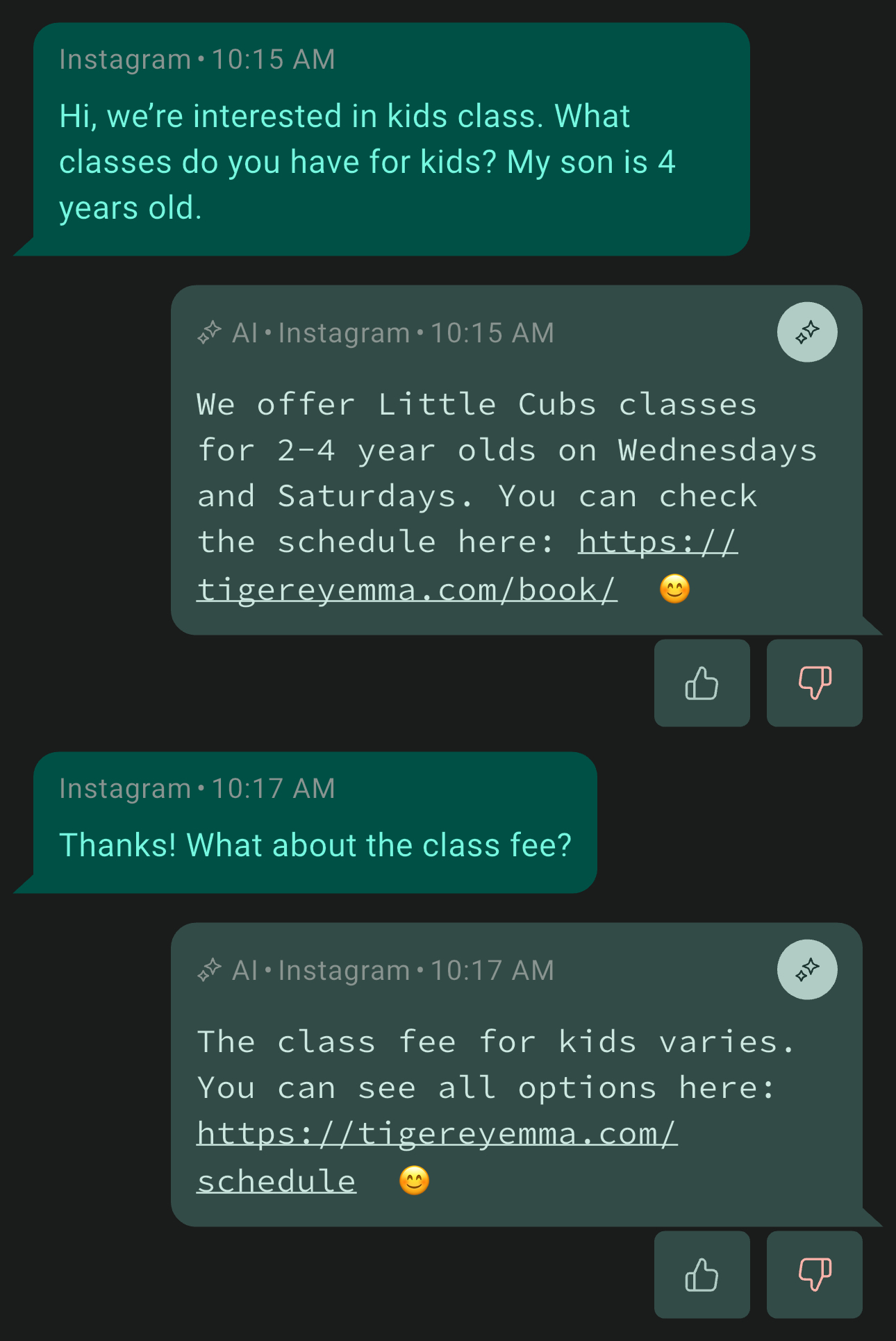 Voor Tiger Eye MMA handelde onze AI Assistent in één maand 752 berichten af, wat het team meer dan 12,5 uur aan handmatig werk bespaarde.